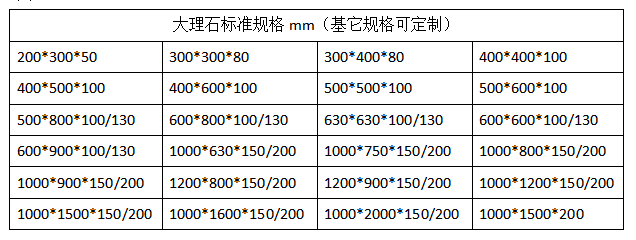 大理石平臺在工廠檢驗、測量,實驗室實驗等方面都適用,大理石平臺一般規格從200*2002000*4000mm不等,我們有自己的標準規格(見圖1。有時候客戶需要的尺寸并不是標準規格,就需要定制,這時候會有客戶考慮說定制大理石平臺是不是比標準的價格高,其實并不是這樣的。大理石平臺的加工是先采用鋸床切割出適合的尺寸,然后經過人工研磨制成的。不管是標準規格還是定制規格,它們的加工工序都是一樣的,像不需要打孔開溝槽的大理石平臺,石料我們是按方算的,而人工研磨的費用是按平方算,所以定制的大理石平臺價格并不高。如果是定制打孔的大理石平臺,那價格就會用變化了,這時候就需要按孔的大小,孔位精度的要求,還要孔的數量來核算價格。還有一點就是材質的選擇,如果要定制濟南青材質的大理石平臺,那價格就要按濟南青石料來算價格。